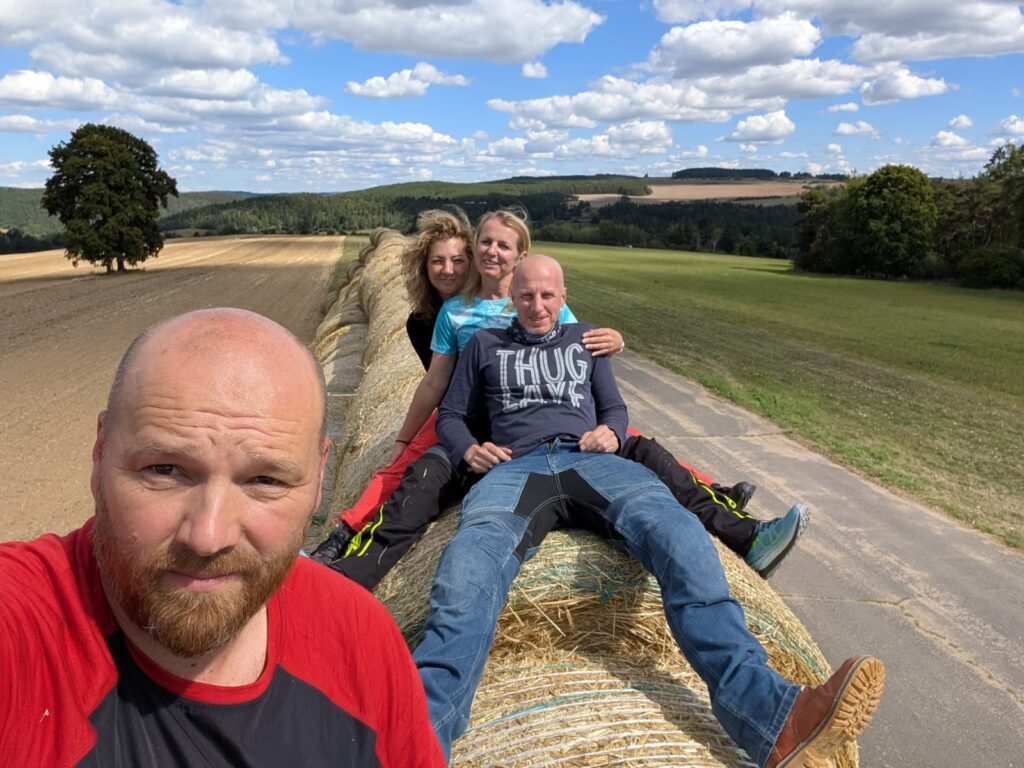 Poslední prázdninovou neděli se rodiče vypravili na motovýlet s Lesounama. Trasa Plzeň – Třemošná – Kaceřov – Kopidlo – Lednice – Kralovice – Potvorov – Rabštejn – Manětín – Nečtiny – Loza – Bělá – Tatiná – Ledce – Příšov – Chotíkov – Plzeň. Přes 100km, očesávka jablek v alejích u cesty, oběd v Nečtinech na návsi a jeden zdolaný stoh 🙂